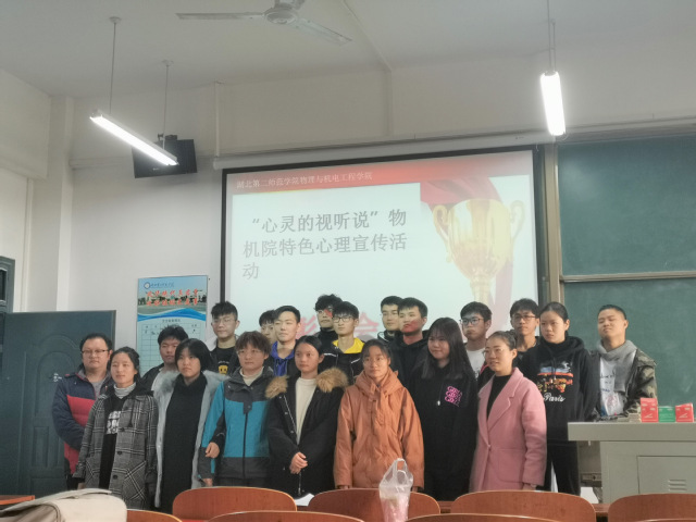 本网讯(通讯员 杨景文)2019年12月3日中午1点,物理与机电工程学院“心灵的视听说”系列活动表彰大会在物机学院S1201教室举行。学院心理健康工作站指导老师刘文君、辅导员章缙以及本次活动所有获奖集体及个人参加本次表彰大会。