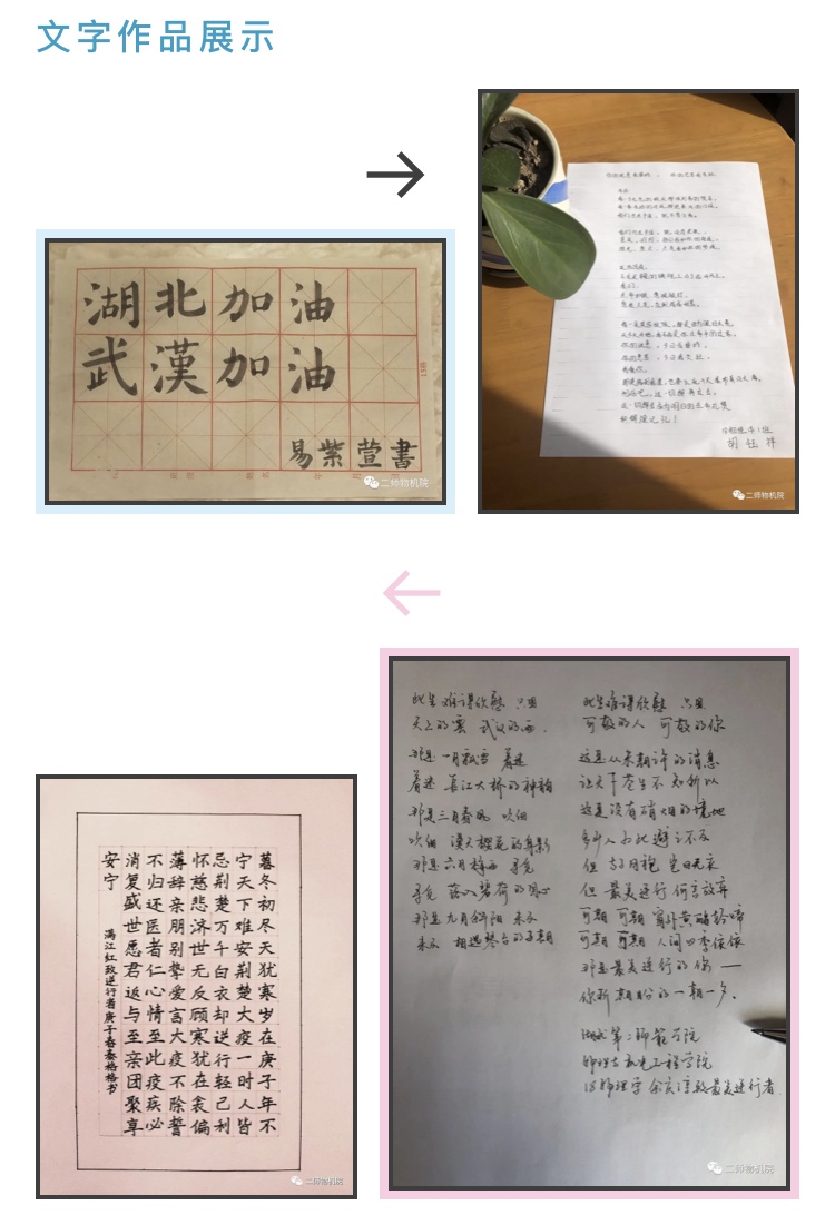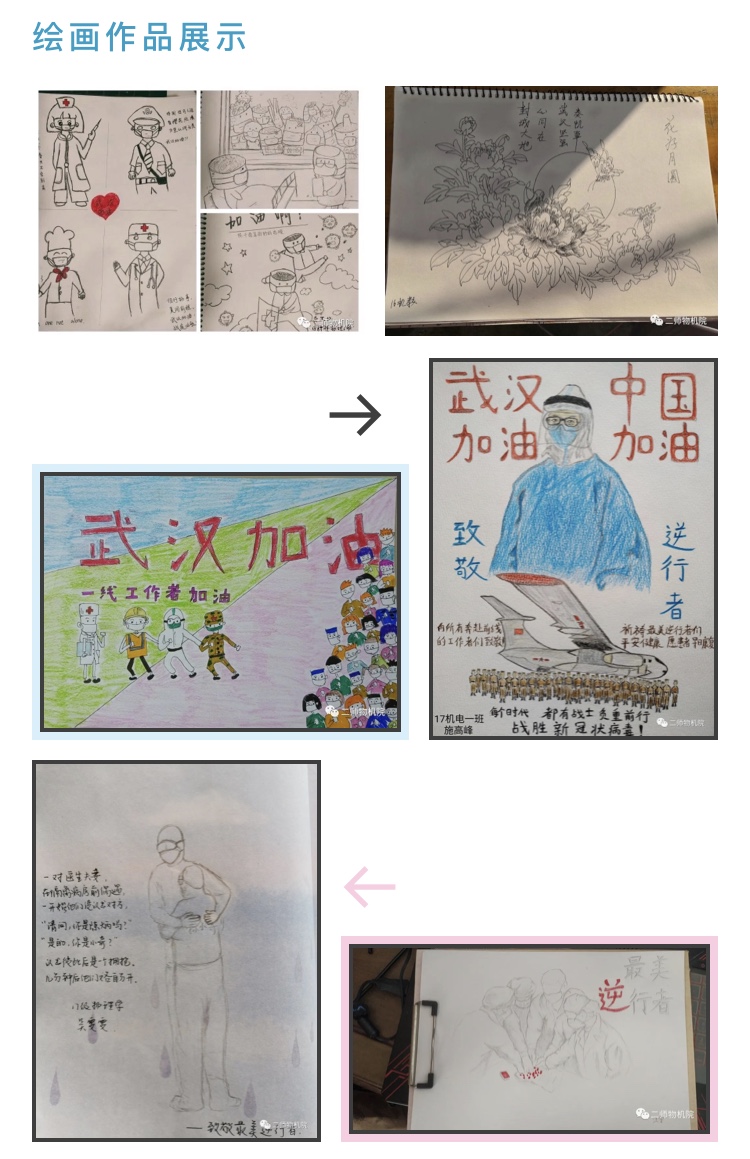 物机学院推出了“纸短情长,为你而作——物机学子为逆行者献祝福”线上宣传作品征集活动。活动一上线便广受同学们的欢迎,党员、入党积极分子、高年级学生广泛参与,截止22日共收到74个作品。一首首的诗句,一幅幅画作,一帧帧的情意表达出他们的致敬,同时也诠释出在疫情面前物机学子的蓬勃向上的正能量。