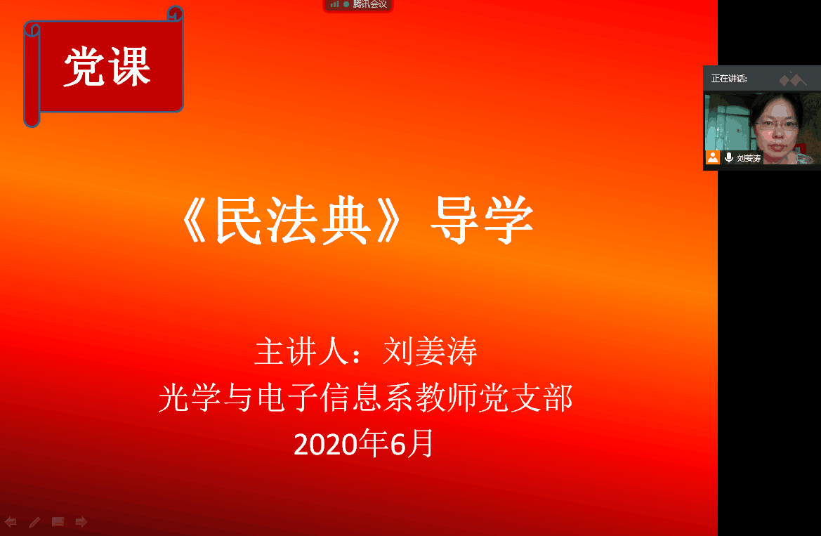 会议上支部书记刘姜涛带领支部党员上了一次线上党课,学习了《民法典》导学。接着部署安排了支部党员在毕业生回校期间值班对接光电系毕业生。要求党员要发挥示范引领作用,注意自身防护安全,圆满完成任务。