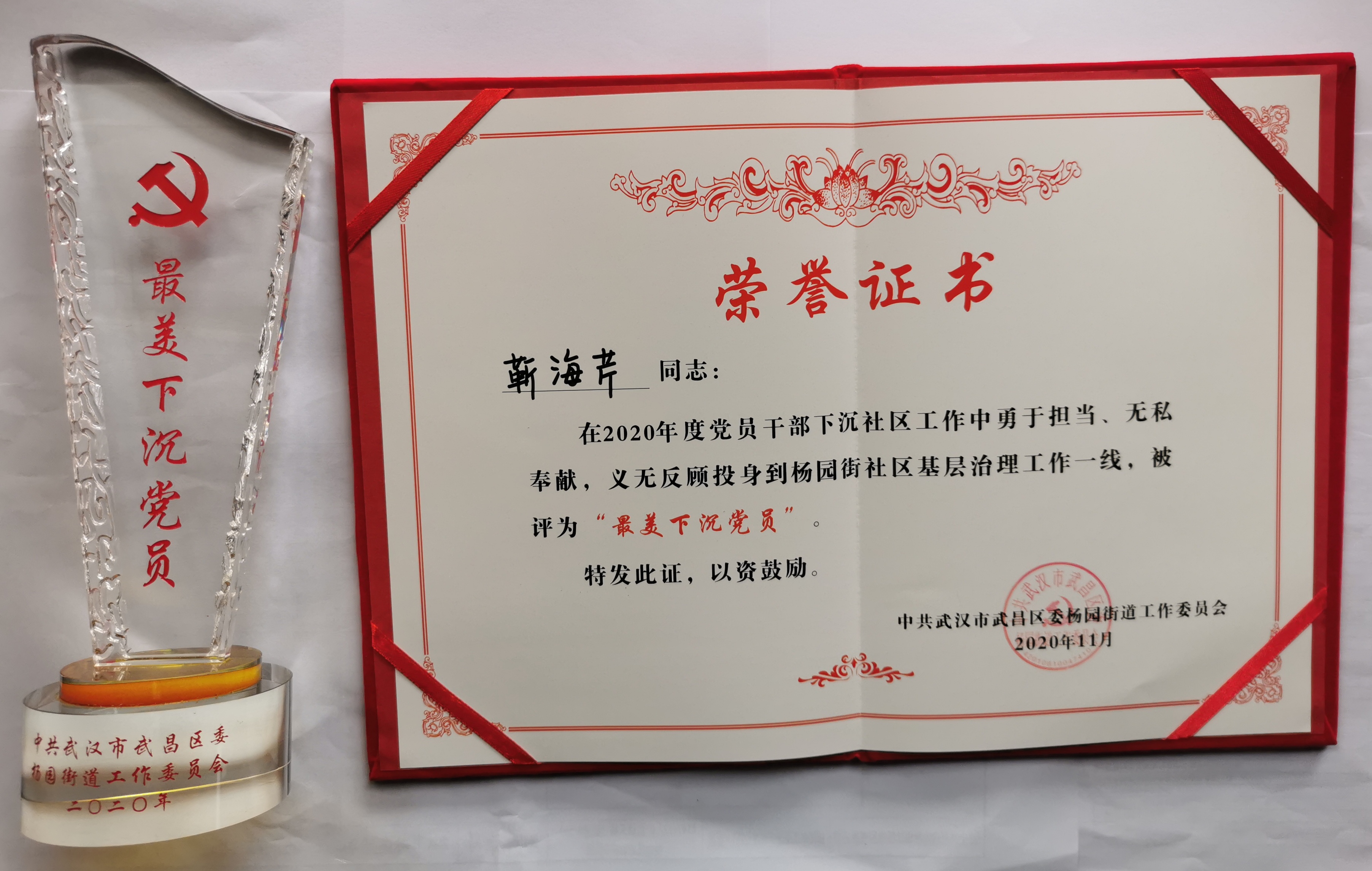 会上,武昌区委杨园街道工作委员会表彰了杨园街14个社区的15名优秀下沉党员,授予他们“最美下沉党员”称号,并颁发荣誉证书和奖杯,我院材料物理系教师靳海芹作为临江社区优秀下沉党员代表获此荣誉。此外,党员代表们还重温了入党誓词,并聆听了武昌区委组织部副部长钱勇同志的微党课。