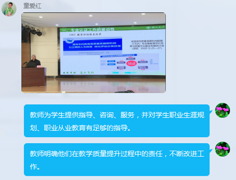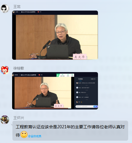 为了更好地开展学习活动,王筠老师推荐老师们观看参与湖北大学专业认证在线研讨会。支部书记刘姜涛指出,工程教育专业认证是中国高校新的风向标,高等教育质量保障体系的重要组成。贯彻落实“学生中心、产出导向、持续改进”的理念,扎实推动一流专业建设,增强“质量意识”,推动我系掀起一场“质量革命”。王怀兴主任强调:“工程教育认证应该会是2021年的主要工作请各位老师认真对待!”