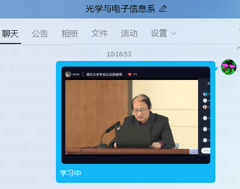 2021年1月15日星期五上午,光学与电子信息系教师党支部全系教师在QQ群开展了“工程教育专业认证”的主题党日活动,全系教师参加了本次活动,并进行了学习讨论。