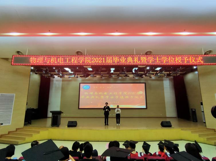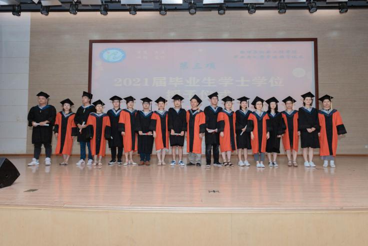 典礼开始,主持人宣读了物理与机电工程学院《2021届本科毕业生学士学位授予名单》,由物理与机电工程学院姚桂玲教授、王筠教授、王秋珍教授、刘明教授、罗毅教授、童爱红教授、王世芳教授、来小禹教授、李睿教授、刘丹教授、刘姜涛教授共十一位教授为毕业生拨穗并合影留念。授予了汪澳等33名同学校级优秀毕业生荣誉称号,李文杰等20名同学院级优秀毕业生荣誉称号,优秀毕业生代表邵遥发表讲话,表达了对物机院、对老师的感激之情,对同学们的依依不舍之情和对未来的畅想。