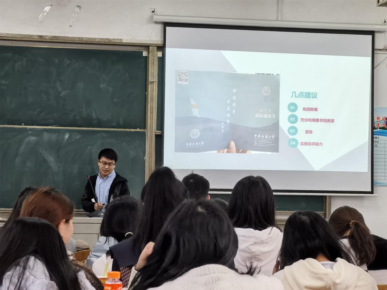 13电子信息科学与技术专业校友李扬,硕士毕业于中国地质大学(北京)。分享自己的考研的经验。他说到当初考研是对名校的向往和就业的压力促成的,并向新生提出四条建议:一要抱团取暖;二要充分利用图书馆资源;三要能坚持,有恒心;四要有实践动手能力。
