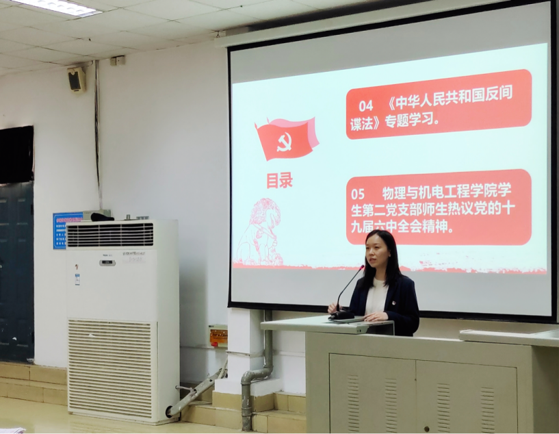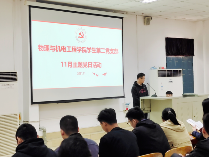 2021年11月17日中午,物理与机电工程学院(以下简称:物机学院)在报告厅4召开物理与机电工程学院学生第二党支部11月主题党日活动,学生第二党支部书记陈曦以及全体学生党员参加活动,组织委员张文同志主持活动。