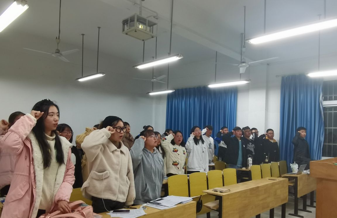 会议第五项,重温入团誓。团员全体起立,朗诵誓词,始终牢记团的使命,在团组织中严格要求自己,积极践行社会主义核心价值观,遵纪守法,品格高尚;自觉遵守团章,模履行团员义务,积极参加团的组织生活和活动,有强烈的团员意识和荣誉感。