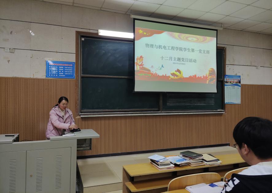 本网讯(通讯员 胡文婧)12月20日,物理与机电工程学院(以下简称:“物机学院”)学生第一党支部于阶梯教室4开展十二月主题党日活动。支部书记刘文君主持活动并讲授党课。