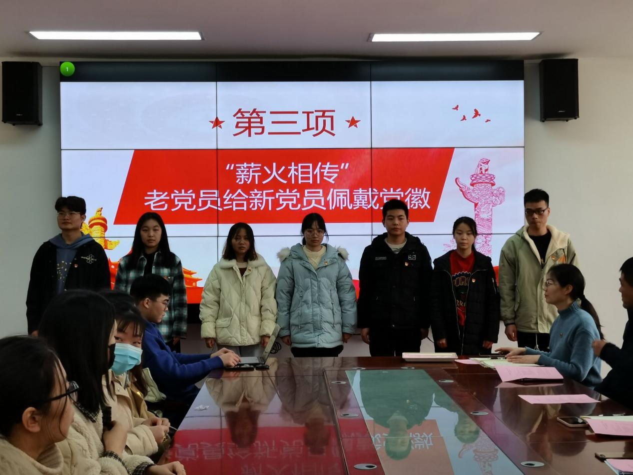 老党员代表张文同志发言,带领新发展党员进行入党宣誓,老党员重温入党誓词;新发展党员代表唐意发言,号召大家在学习生活中也要不忘初心、牢记使命,努力做好一个优秀的党员。