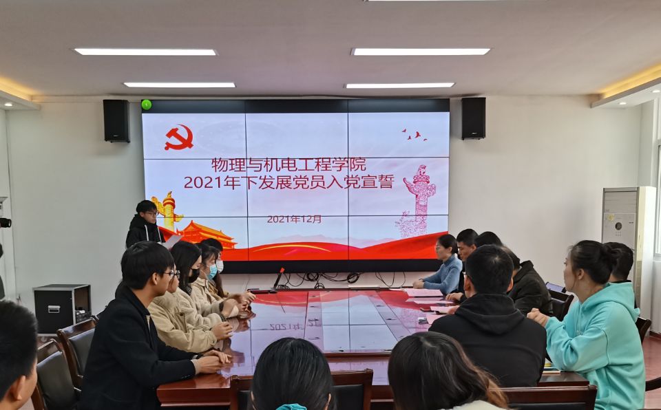 本网讯(通讯员 周蜜 摄影 柳宇轩)2021年12月30日中午,物理与机电工程学院(以下简称物机学院)2021年下新发展党员入党宣誓活动在学院会议室如期举行。物机学院党委书记王志民,党委副书记陈扬,组织员张锐,学生党支部书记刘文君、陈曦,材料物理系教师党支部书记李睿,光学与电子信息系教师党支部书记马晓萌,汽车与机电工程系数教师党支部书记翟建波出席会议,物机学院党员服务站李镇伍主持会议,2021年下半年新发展党员参加会议。