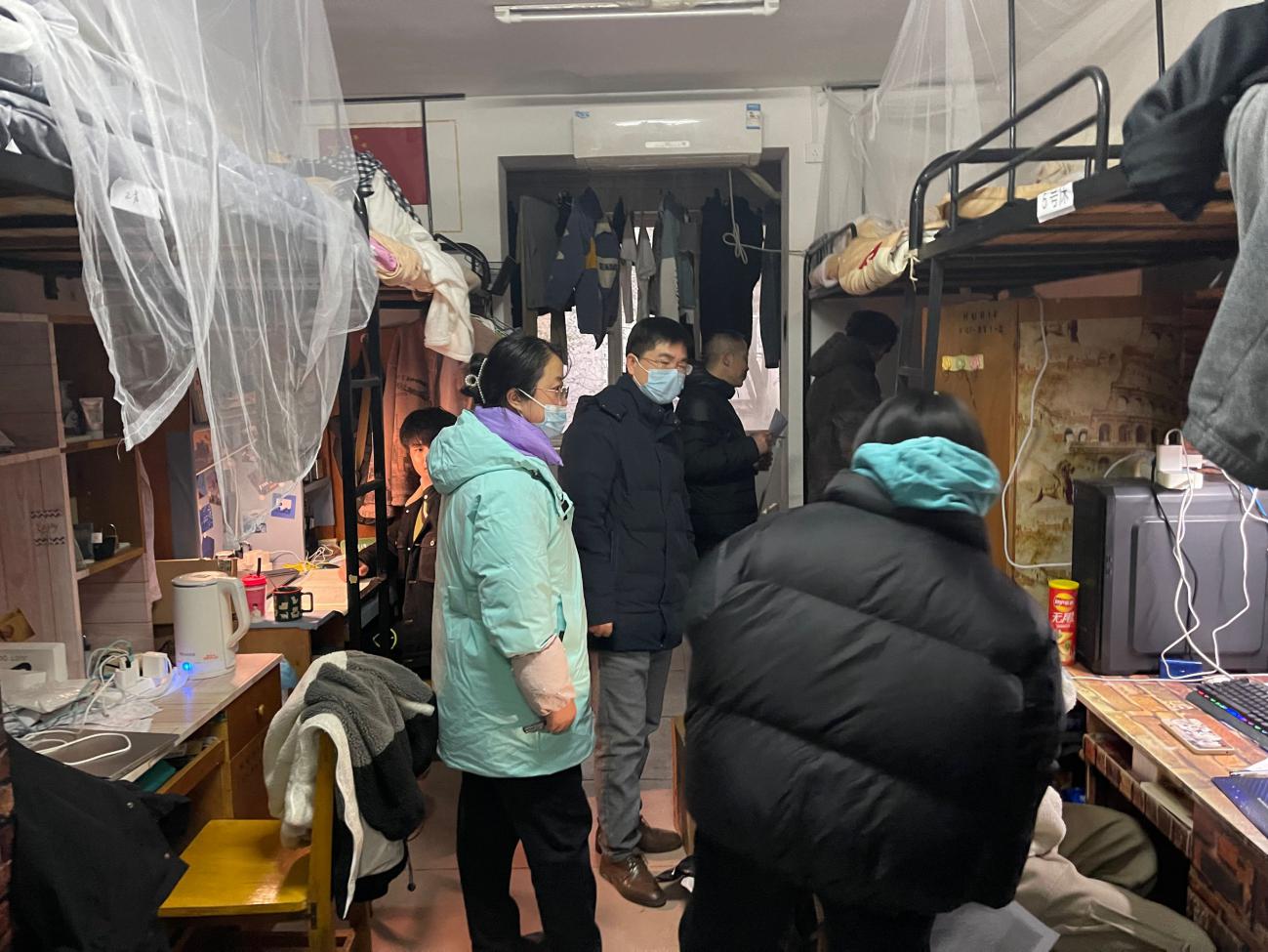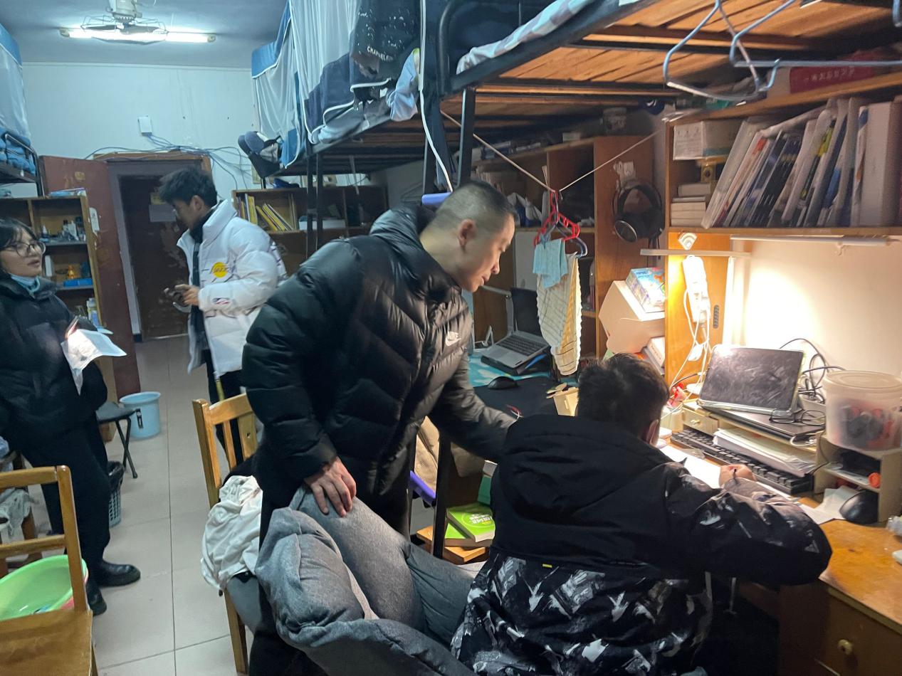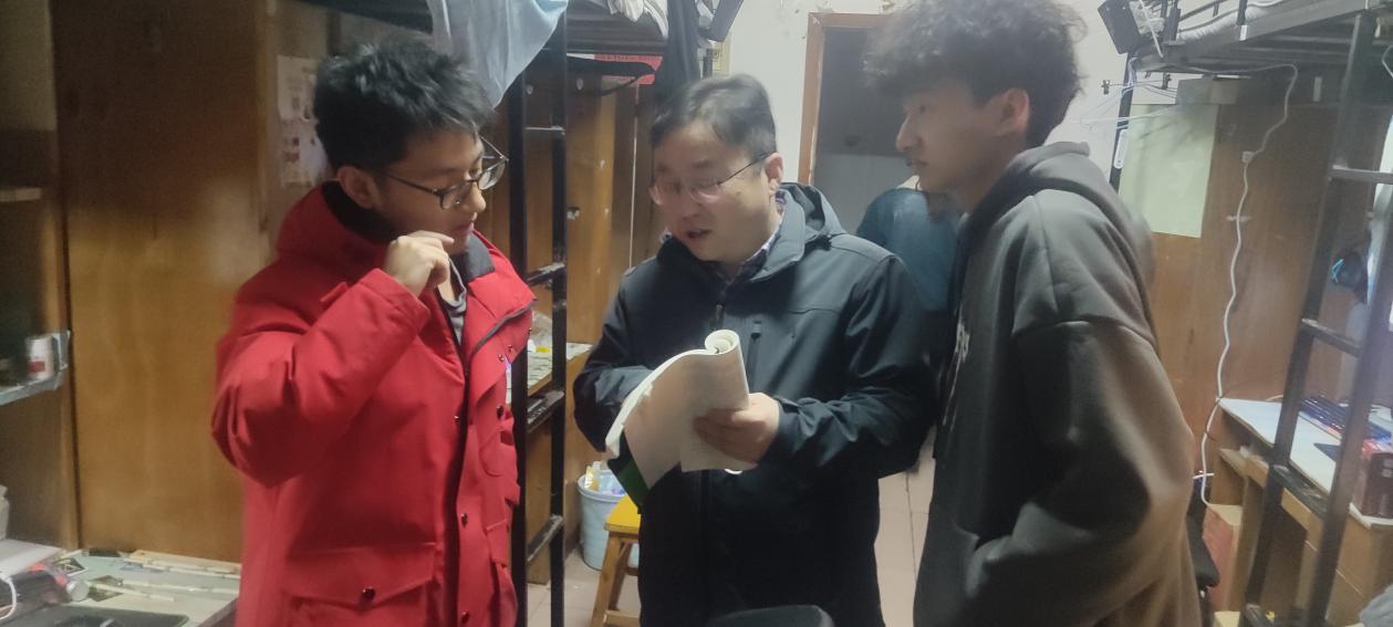 本网讯(通讯员 吴瑞翔 刘子涵 摄影 吴瑞翔 罗豪 王俊娇)1月5日下午3:30,物理与机电工程学院(以下简称:物机学院)开展每月一次的例行查寝活动,物机学院党委副书记陈扬、副院长李杰带领“师友班导”班主任、全体辅导员参加。老师们全方位走访和检查物机院学生宿舍,排查安全隐患,检查寝室卫生,提醒同学们天气转冷注意保暖。