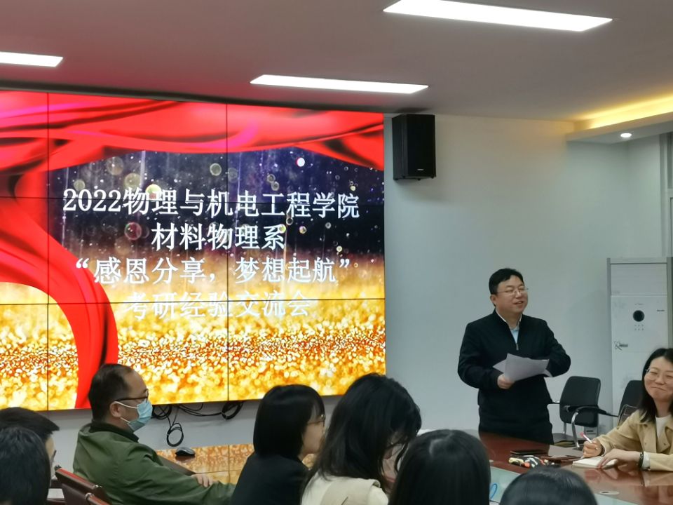 本网讯(通讯员 柳宇轩 摄影员 柳宇轩)4月15日晚6时物理与机电工程学院(以下简称物机学院)于一号会议室开展材料物理系“感恩分享,梦想起航”考研经验交流会,邀请成功考取研究生的11位18级学长学姐为材料物理系同学分享考研心得。副院长李杰,系主任汪川惠,专业负责人陶军晖,杨辉,辅导员刘文君、章缙以及各级材料物理学生参加会议。会议由汪川惠主持。