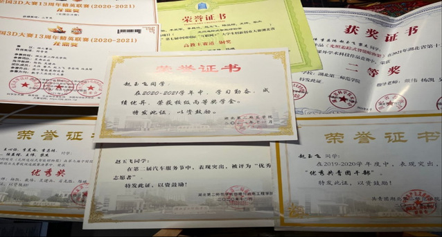 个人荣誉:2021年7月获全国3D大赛13周年精英联赛国家级三等奖,2021年7月获第七届中国国际“互联网+”大学生创新创业大赛省高教主赛道铜奖,2021年9月获第十七届“挑战杯”全国大学生课外学术科技作品竞赛黑科技专项赛 全国“卫星级”作品, 2021年10月获第九届“挑战杯”大学生课外学术科技作品竞赛校一等奖,2021年11月参与2021年全国大学生创新创业训练计划项目(202114099017)国家级,2019——2020学年优秀学生干部,2019——2020学年校级丙等奖学金。