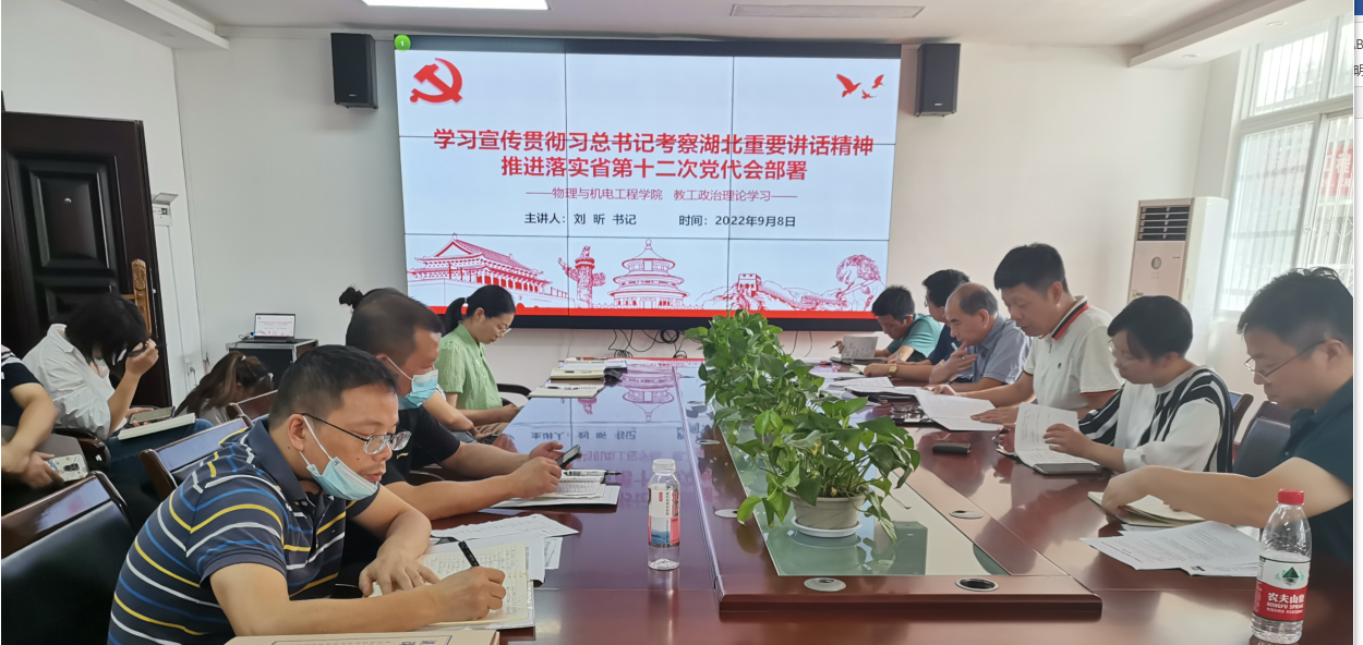 本网讯(通讯员 张锐 王亦昕)9月8日14:30,物理与机电工程学院在会议室召开2022年秋新学期第一次全体教职工政治理论学习大会。校纪委书记刘昕以《学习宣传贯彻习近平总书记考察湖北重要讲话精神 推进落实省第十二次党代会部署》为主题,给全体教职工进行开学第一课理论学习。