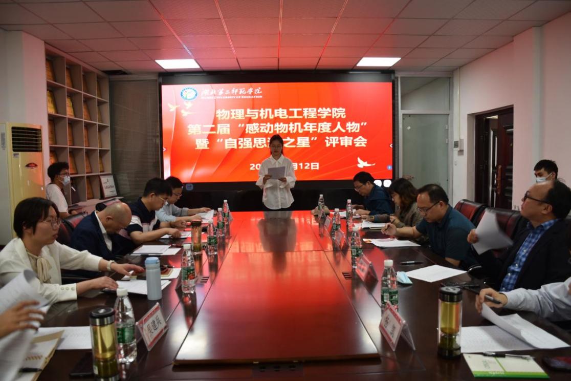 本网讯(通讯员 廖雨彤 沈子颖)为深入学习贯彻习近平新时代中国特色社会主义思想和党的二十大精神,落实立德树人根本任务,激励广大学生受助思源、获奖思进、自强不息、励志成才,培养学生良好的思想道德品质,营造积极向上的校园氛围。物理与机电工程学院于5月12日在党员活动室举办了第二届“感动物机年度人物”暨“自强思源之星”评审会。物机学院党委书记肖明、院长李莎、党委副书记陈扬、副院长吴建兵、副院长李杰、学工部学生成长服务科主管桂利军、物理与天文系系主任胡森、材料物理系系主任汪川惠、汽车与机电工程系系主任杨凯、光学与电子信息系系主任王怀兴出席并担任评委。