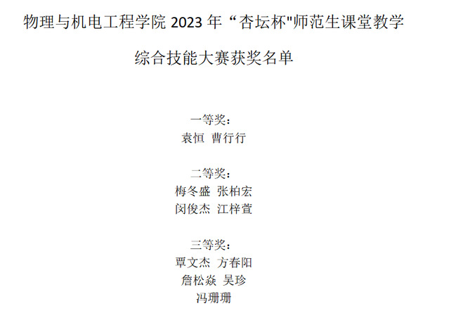 成功举办的杏坛杯师范生课堂教学综合技能大赛不仅为我院物理学学生提供了一个实践与交流的平台,同时也是展示自我、提升个人能力的宝贵机会。