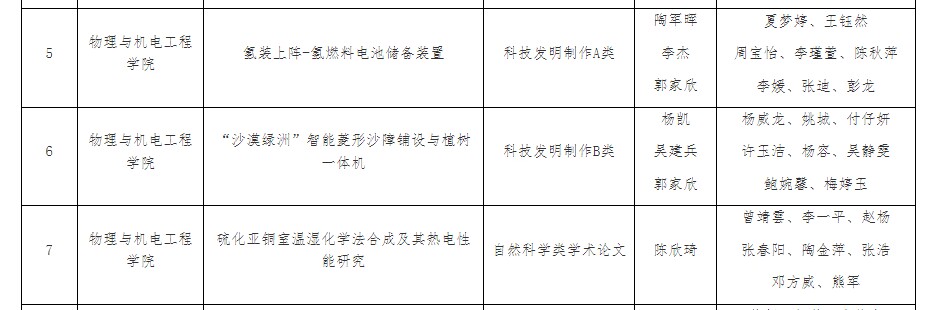5月26日至28日,在湖北省第十四届“挑战杯·中国银行”大学生课外学术科技作品竞赛中,我院参赛项目:“沙漠绿洲”智能菱形沙障铺设与植树一体机荣获一等奖;氢装上阵——氢燃料电池储备设置、硫化亚铜室温湿化学法合成及其热电性能研究荣获三等奖!