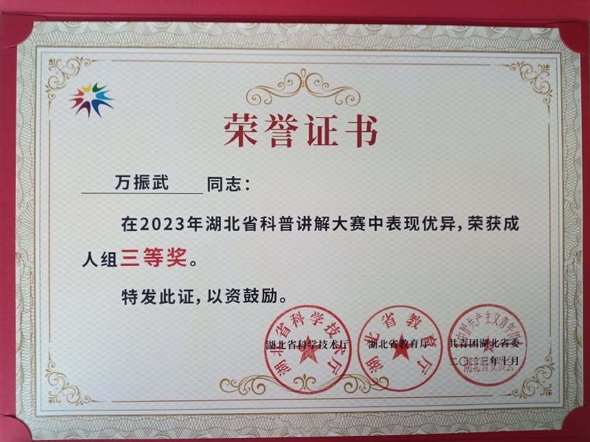 本网讯(通讯员 杨宏鑫)近日,2023年湖北省科普讲解大赛获奖名单公布,物理与机电工程学院万振武老师荣获成人组三等奖。