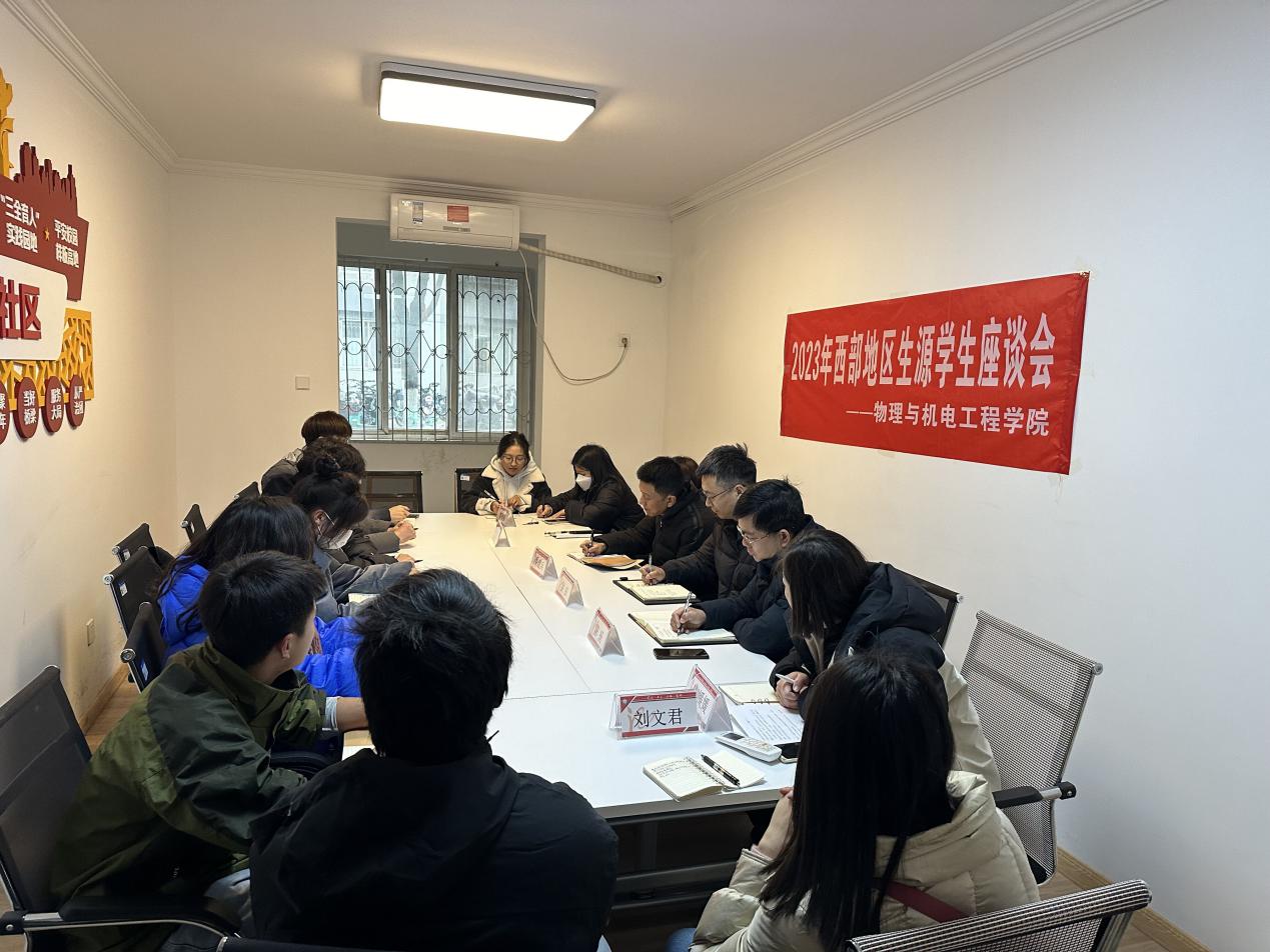 本网讯(通讯员 刘诗怡 )为了解西部地区生源学生在校学习生活情况,更好的服务学生成长,12月13日中午,物理与机电工程学院(以下简称“物机学院”)在西三“一站式”学生社区举办西部地区生源学生座谈会。物机学院党委书记吴田、党委副书记陈扬、副院长吴建兵、辅导员刘文君、刘方芳、廖雨彤及西部学生代表参加座谈会。学工办主任冯媛媛主持会议。