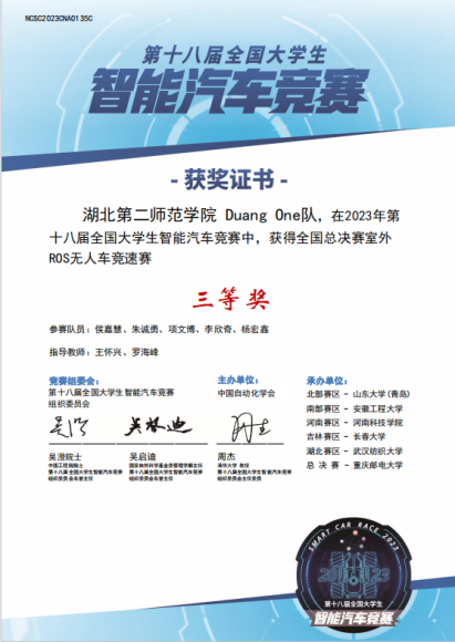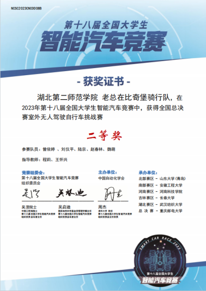 我校物理与机电工程学院由万振武、罗海峰、程莉、王怀兴等几位老师组织指导的10支队伍、共50名学生,参加了本次全国大学生智能汽车室外专项赛中“室外无人驾驶自行车挑战赛”、“室外ROS无人车竞速赛”两个赛项的比赛,获得了全国二等奖2项、全国三等奖1项、湖北省三等奖4项的优异成绩。