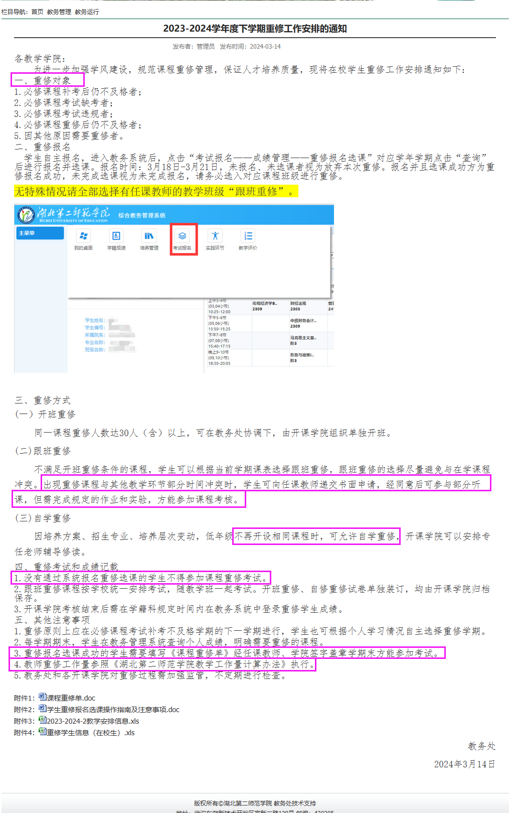 ③非毕业生跟班重修上课时间如与其他课程冲突的,需向任课教师说明情况并申请部分课程跟班学习,按教师要求完成规定的作业和实验,方能参加课程考核。