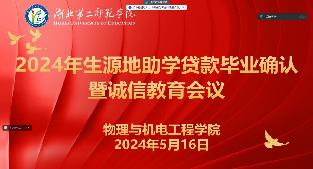 本网讯(通讯员 罗雅琪)为进一步加强生源地助学贷款贷后管理,提升贷款风险防范能力,确保生源地助学贷款工作持续健康发展,明确贷款毕业生还款责任;同时为进一步加强毕业生诚信教育,增强毕业生的诚信意识和责任意识,弘扬诚实守信的传统美德。物理与机电工程学院于2024年5月16日晚上8点在线上召开2024届毕业生助学贷款还款确认暨诚信教育会议。此次会议由物理与机电工程学院资助中心指导老师廖雨彤主持,由学院资助中心李顺主讲。
