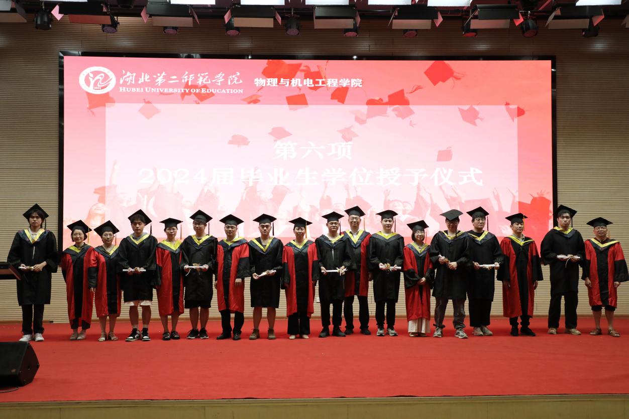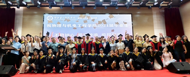 本网讯(通讯员 胡振宇)2024年6月21日晚,物理与机电工程学院(以下简称“物机学院”)在新图书馆二号报告厅举办“【依依物机】物悔流年,机扬青春,院君梦圆”2024毕业典礼暨学位授予仪式。物机学院党委书记吴田、院长李莎、学科建设办公室副处长李杰、物机学院副院长吴建兵、老师代表、毕业生代表、学生代表和50余名学生家长参加活动。张锦东、帅雪婷主持仪式。