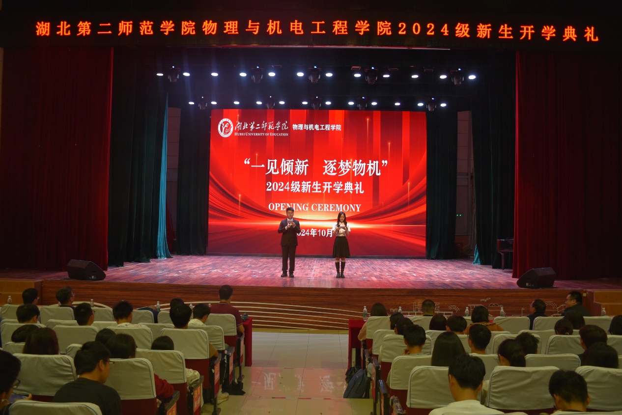 本网讯(通讯员 邓哲皓)10月17日,物理与机电工程学院(以下简称“物机学院”)于学校大礼堂举办2024级新生开学典礼。物机学院党委书记吴田、院长李莎、党委副书记陈扬、各系主任、专业负责人,24级“师友”班导、“学友”班助、教师代表及2024级全体新生参与典礼。典礼由张睿锦、唐征主持。