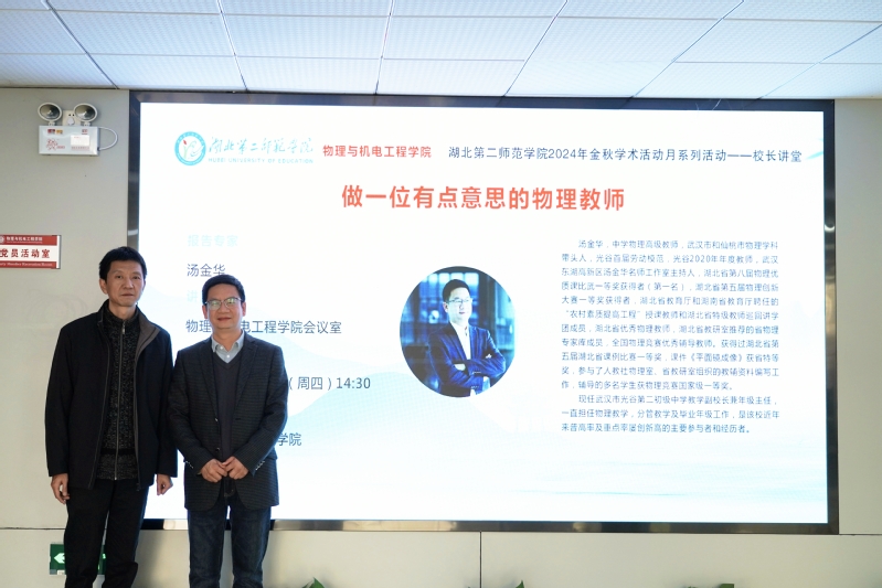本网讯(通讯员 张祖满)为培养物理学师范专业学生严格遵守教师职业道德规范,努力成长为有理想信念、有道德情操、有扎实学识和仁爱之心的优秀教师,物理与机电工程学院于11月28日下午在学院会议室举办2024年金秋学术活动月系列活动-校长讲堂第二期。本次讲座特别邀请了武汉市光谷第二初级中学副校长汤金华作专题报告,主题为《做一位有点意思的物理教师》。物理与机电工程学院党委书记吴建兵出席活动,2023级物理学1班和物理学优师2班全体学生积极参与。讲座由物理学专业负责人张祖满主持。