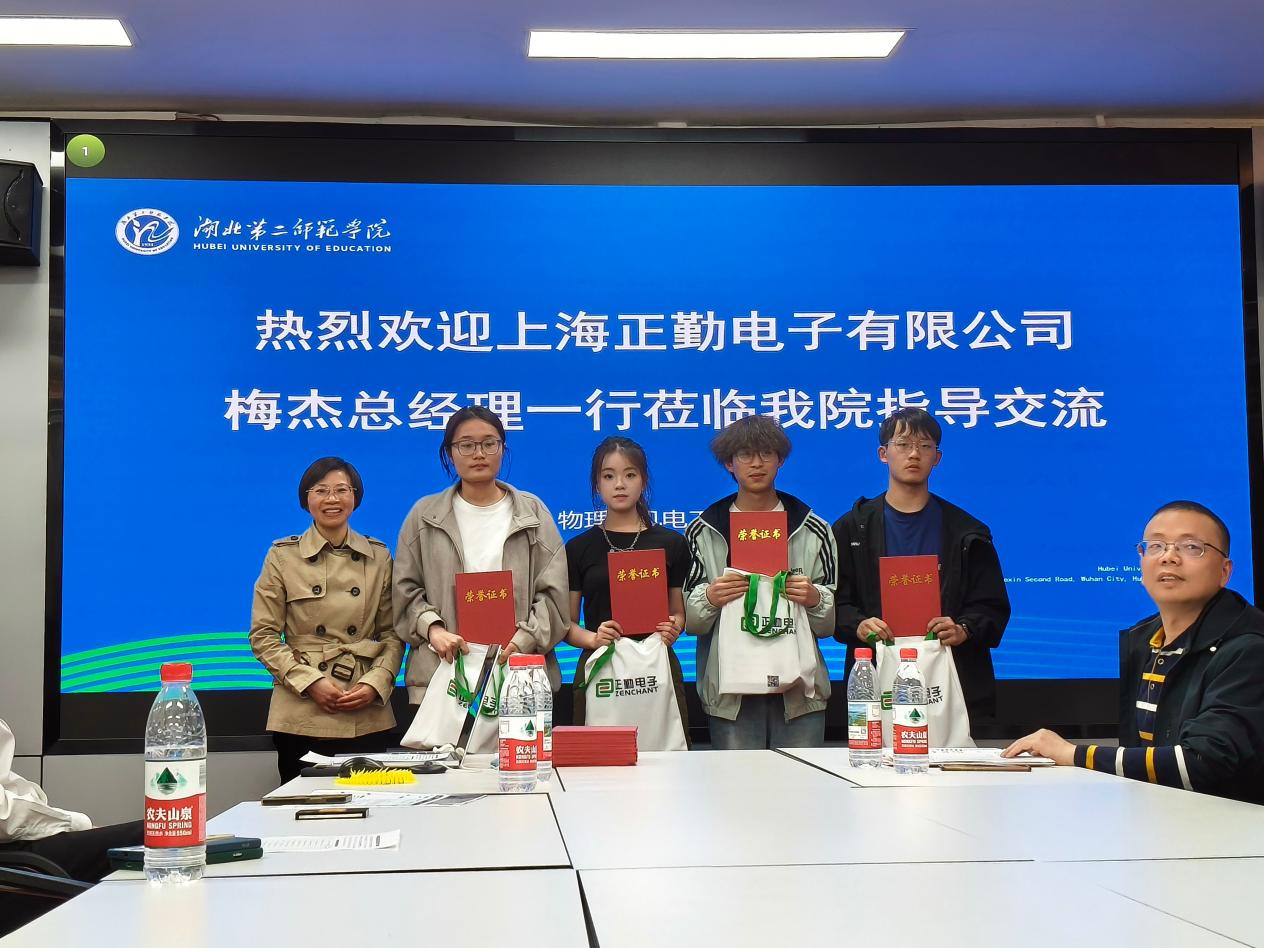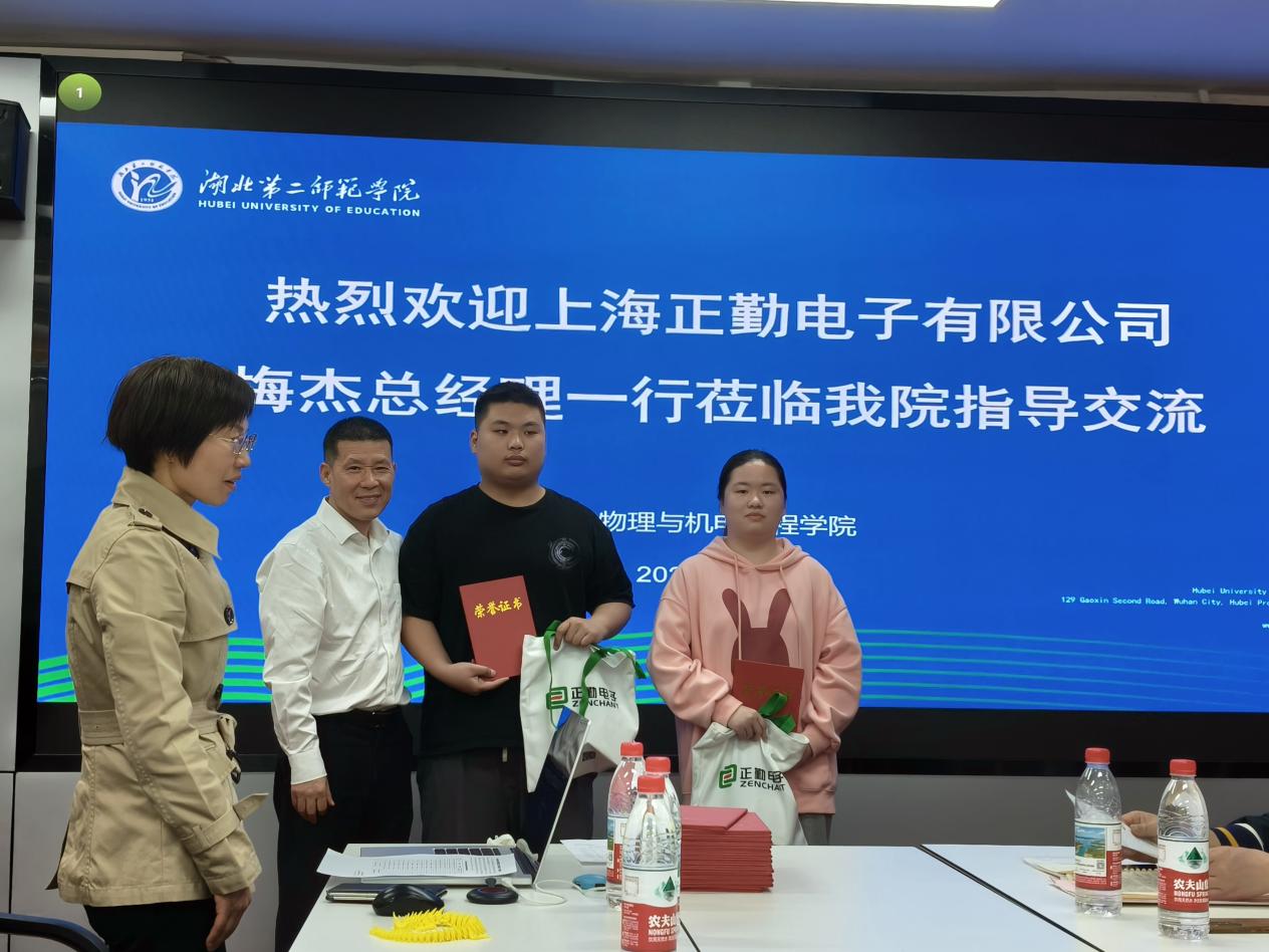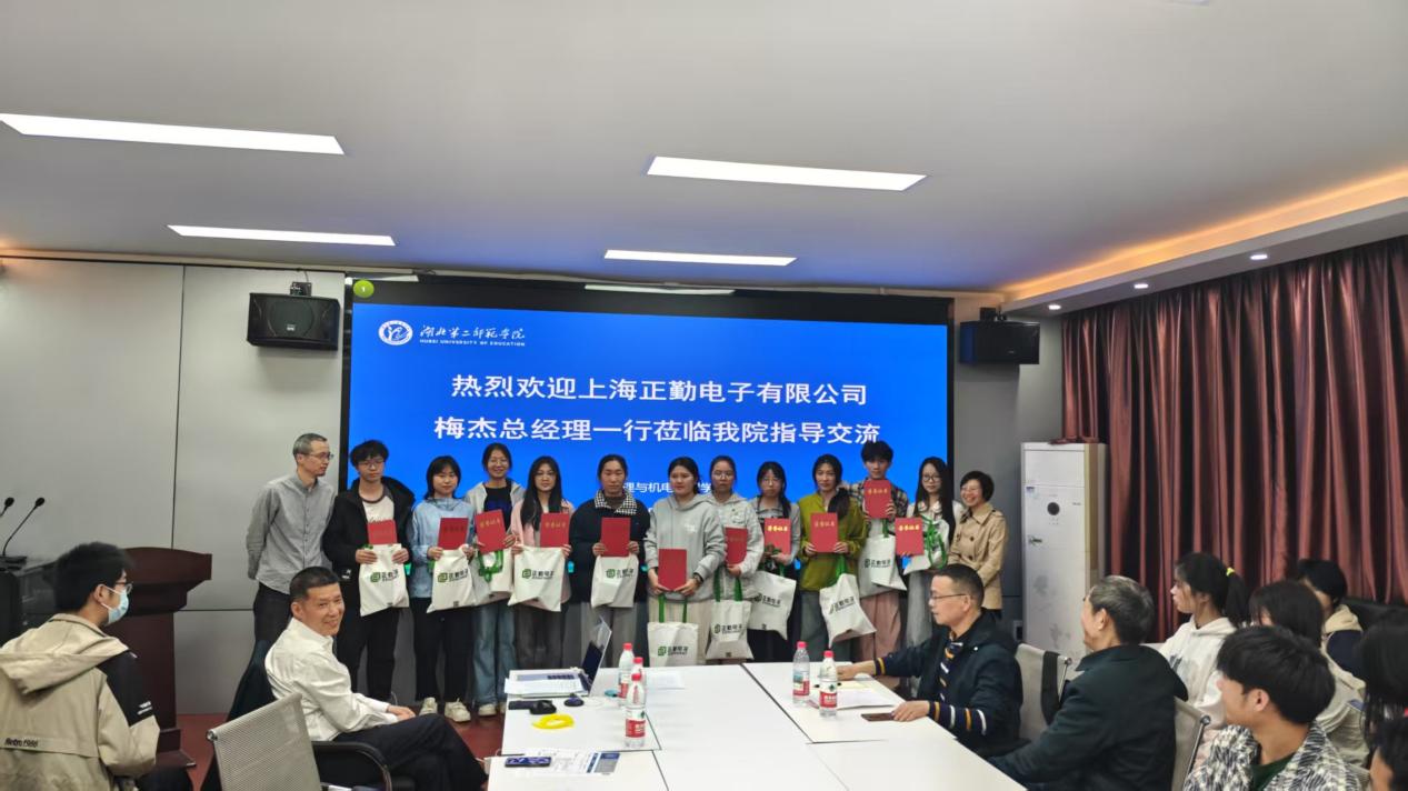 4月7日下午18时,梅杰一行赴物理与机电工程学院一楼会议室,与学院”机器人设计与智能控制大学生创新实验基地(后简称大创基地)”的全体师生见面,在光学与电子信息系主任王怀兴的主持下,为学院大创基地获得2024年第四届正勤科创奖学金的同学们举行颁奖仪式,正勤电子有限公司总经理梅杰、人力资源总监张燕珍、研发部姜总工程师分别为获奖学生颁奖。