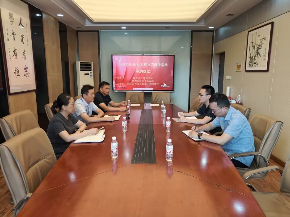 座谈会上,张祖满就学院基本情况及物理系学生人才培养进行了简单介绍,并提到“荆楚优师计划”人才培养特色。袁新军校长充分肯定了我院人才培养模式,并对我院物理与天文系2024届毕业生尹义轩老师的工作进行了充分的肯定,对其肯吃苦、愿奉献的态度表示赞扬。同时特别提到我校行知班培养的学生,对其学习和工作能力都予以了肯定。会上,双方签订了“共建实习就业基地协议书”,并为后期合作交流展开了充分讨论。