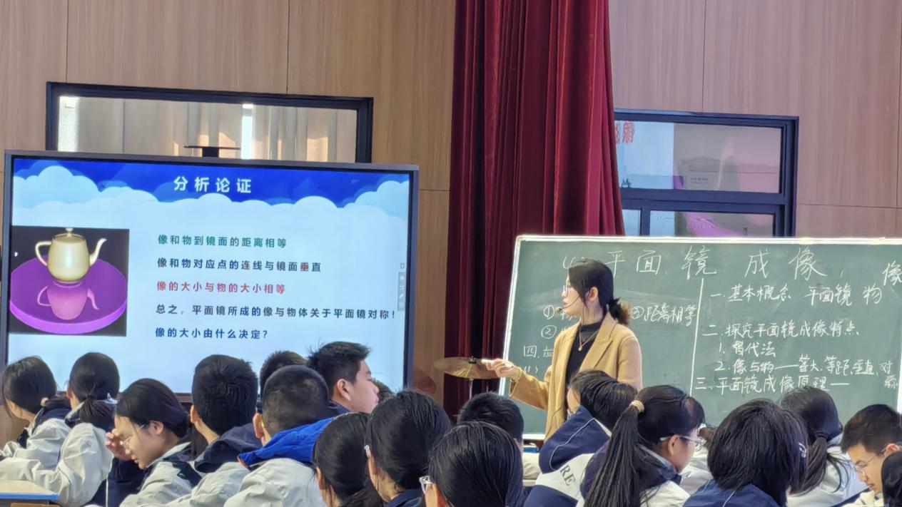 本次授课围绕初中八年级知识《平面镜成像》展开,师范生以趣味实验“照镜子”为切入点,用生活中的现象引出物理原理。课堂上,刘玉婷通过演示实验、小组讨论、学生上台互动等方式,引导学生主动思考,将抽象的物理公式转化为直观的实验现象,让学生在动手操作中感受物理学科的魅力。面对学生的提问,师范生从容回应,灵活调整教学节奏,展现了扎实的专业基础和良好的课堂把控能力。