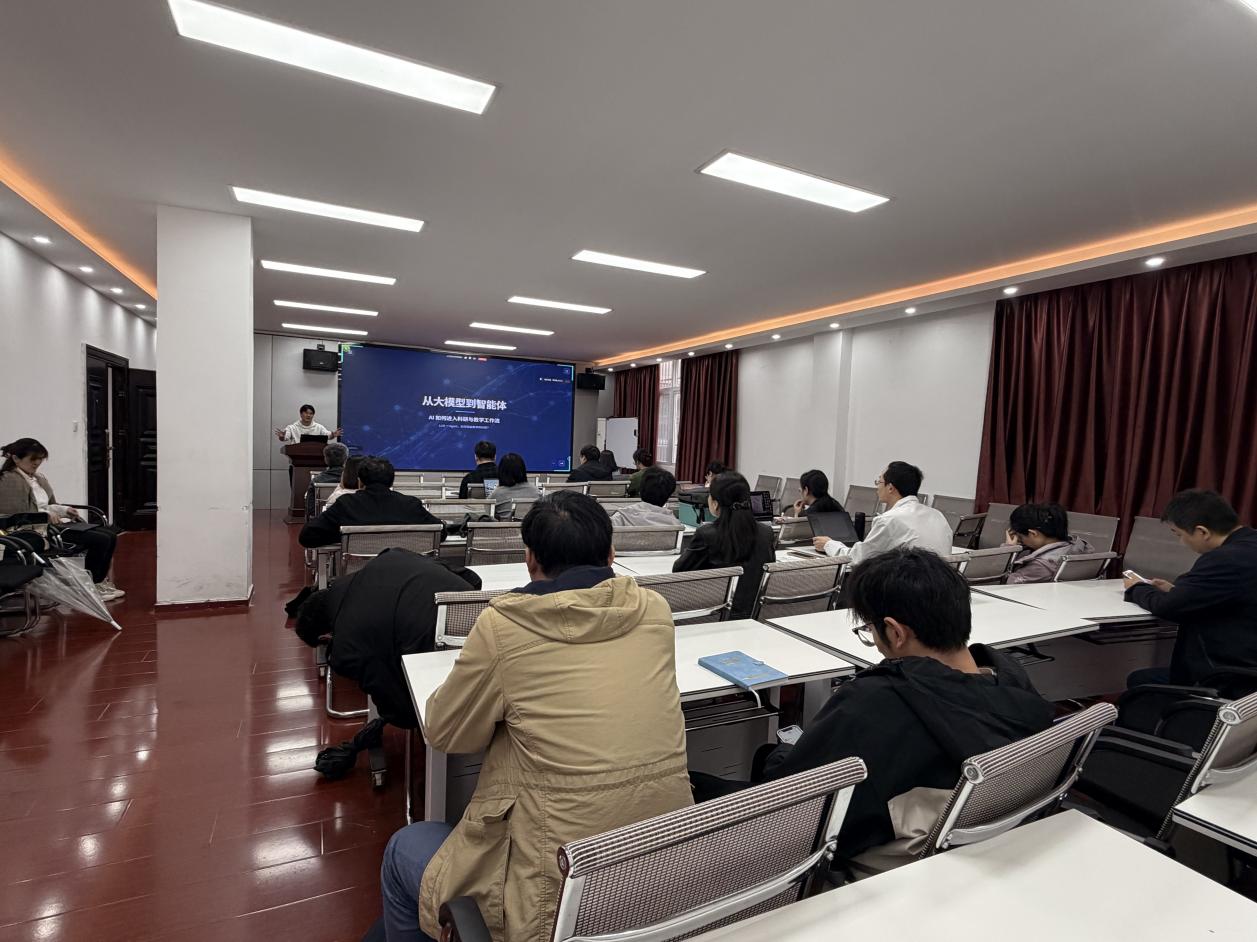 讲座邀请AI智能体平台研发工程师宋经纬担任主讲。他从科研和教学两个维度分别介绍了AI智能体的应用场景。在科研方面,主讲人重点讲解了AI智能体如何辅助文献检索与梳理、实验数据初步分析、研究思路生成等环节,帮助教师提升科研效率。在教学方面,首先梳理了AI智能体与通用语言大模型的核心区别,指出智能体在任务执行、场景适配、自主优化等方面的特点,帮助教师厘清技术概念,随后结合理工科、文科、师范类等不同学科的教学实际,通过具体案例展示了智能体在课程设计、资源整合、课堂互动等环节的潜在应用。在交流环节,与会教师围绕课程场景搭建、教学案例生成、AI智能体搭建等实操问题与主讲人进行了深入探讨,现场气氛热烈。
